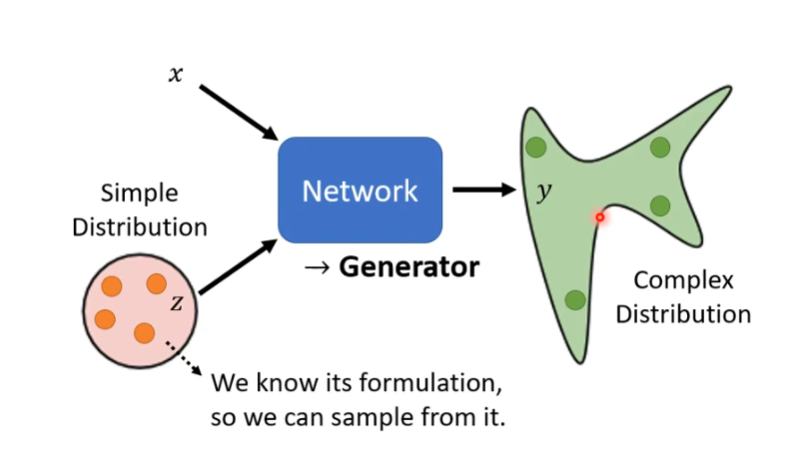 用network当作生成器,每一次随机生成对应的z,知道对应的分布是简单的,已知的均匀分布或者是正态分布,network的输出变成复杂的范围。