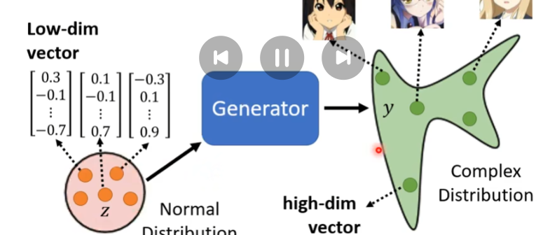输入一个正态分布,生成一个低维的向量,会生成一个二次元人物的脸,产生一个非常高维的向量,输入不同,输出就会不同。选择一个简单的分布函数。