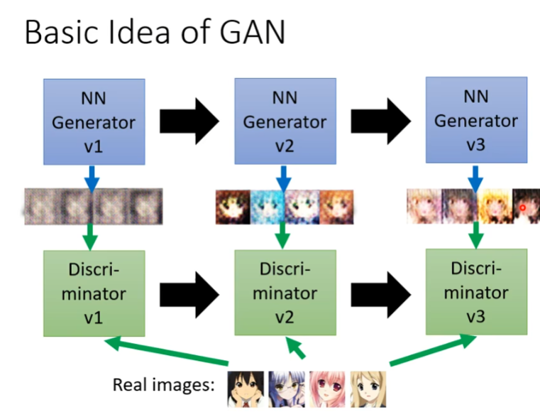 对应的生成器与对应的判别器之间会不断的进行对抗,这也就是生成式对抗神经网络的由来。adversarial。这也就是人类的比喻、