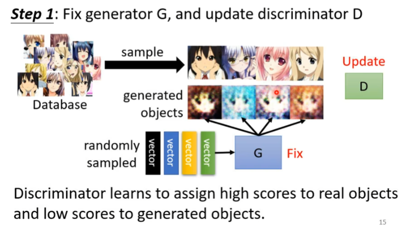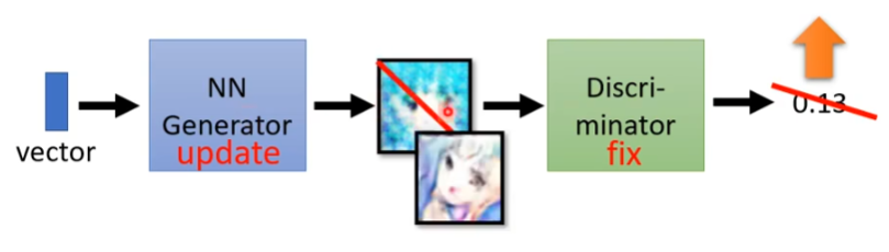 **2.相反的操作,**对应的G去欺骗判别器,争取以假乱真。G不断的更新对应的参数,看判别器的评分,两者接起来,当作一个大的network来看。整个大的结果其中某一个输出就是一张大的图片,调整对应的G的参数,不去调试对应的D的对应的参数。只去调整生成器。训练的方法没有什么不同的。对应的目标就越大越好(对应的D的积分)